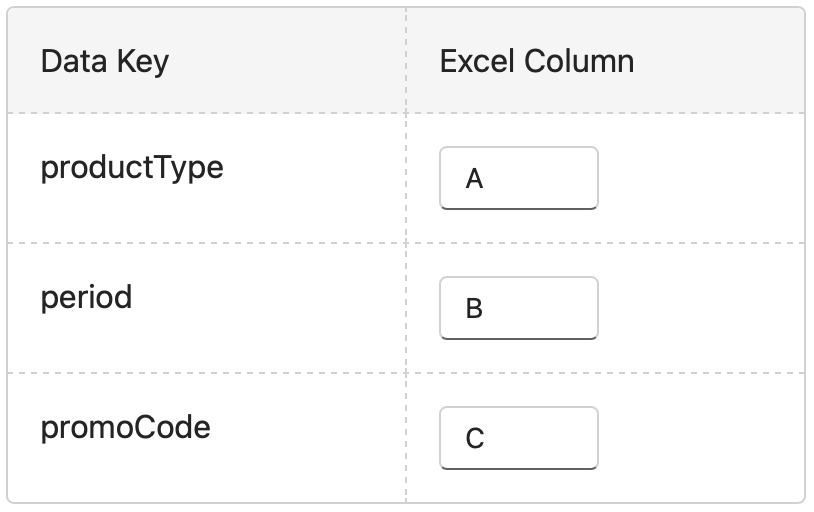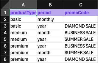 In the example image above, you can see that there are 3 types of data (productType, period and promoCode). The header column (purple row) with the data key is not necessary, but can be used to leverage the autocomplete feature (we will talk more about this feature in the column mapping step)