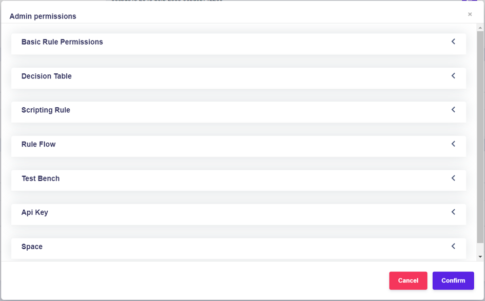 Settings of the roles are done in the window called “Admin permissions”. Those admin permissions are divided into basic rules permissions and permissions of each feature in the DecisionRules such as: