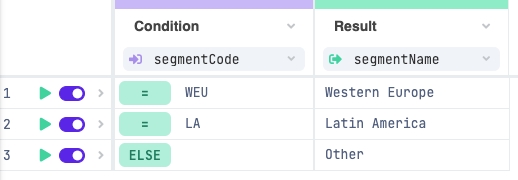 As for the table itself, let us keep things simple and just add a couple of rows. Based on the matched segment code, we will return the corresponding segment name. The table can look e.g. as follows.