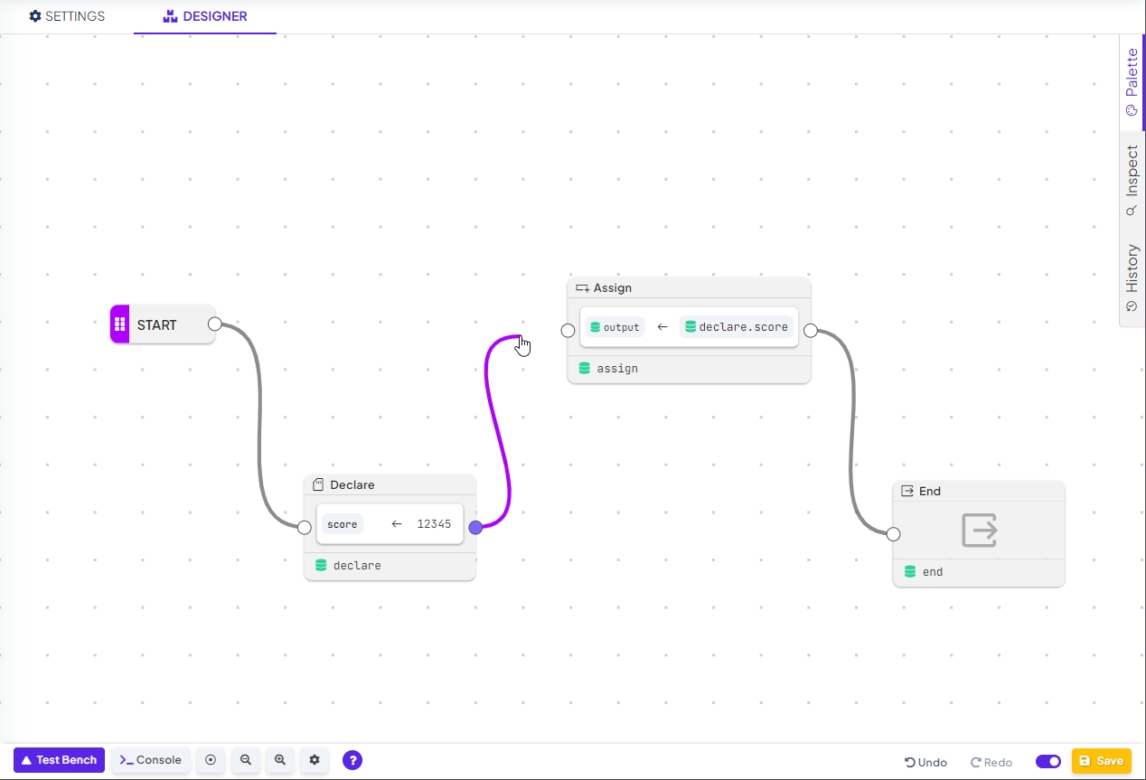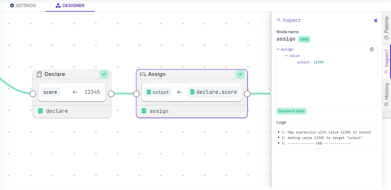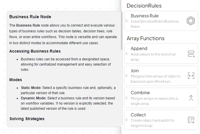 Nodes in the workflow act as containers for specific actions or steps. Each node represents a task, such as declaring and assigning values, processing data, evaluate other business rules or run custom code. These nodes help structure and visualize the workflow.