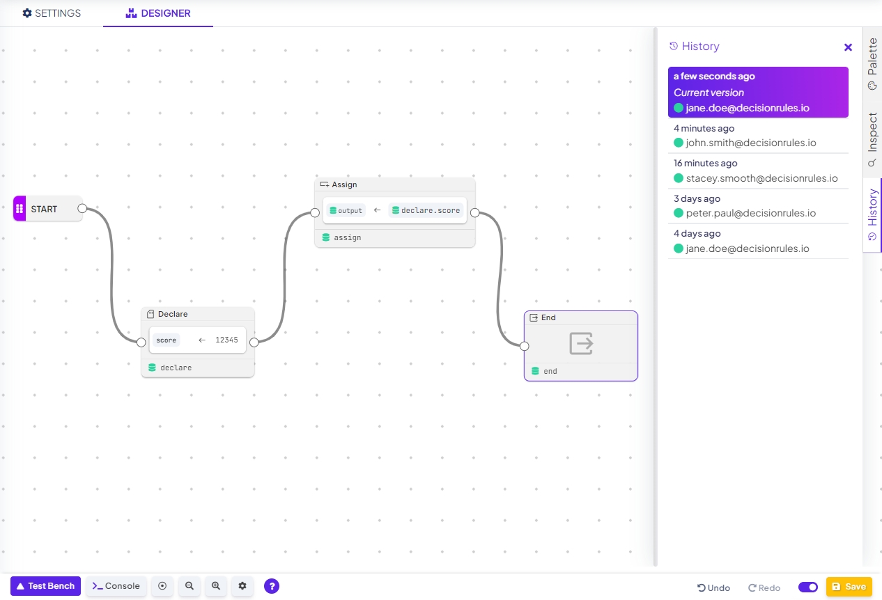 The blank designer features the canvas with a single node: the Start. The designer window features the usual bottom bar, where we can open the test bench. Next, on the right hand side, there are several additional tabs. For now, we will focus to the most important one: the Palette.