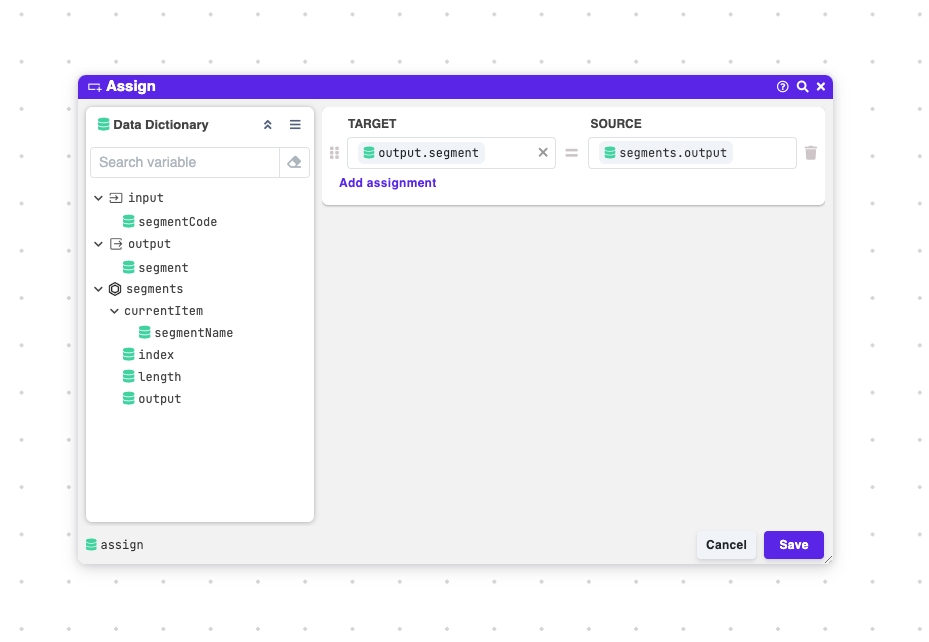 The node detail window is already familiar to us. We just need to add a single assignment. See that the Assign configuration contains target and source. Under target, we will put output.segment, and in source we enter the result from our Business Rule. It can be found in the Data Dictionary by its node alias segments, and we are interested in its output, therefore using segments.output. Both these variables can be simply dragged and dropped from the Data Dictionary. Our Assign is complete.
