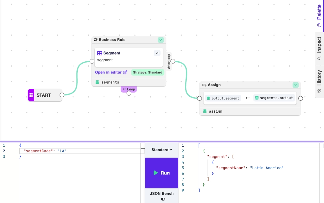 Note that the segment attribute on the output actually contains an array [] with a single object {}, which in turn contains the segmentName. This rather complex data structure follows from how we set up our Assign. Under segment, we have mapped the whole output of the Segment table. Later we will see how the result can be simplified or transformed to any form you like.