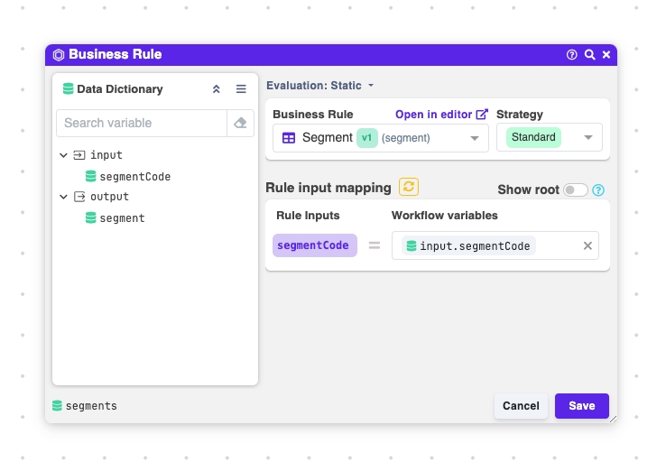 At this point, it is suitable to pay some attention to the Data Dictionary section on the left hand side of the window. Upon expanding the items, we shall see the predefined input and output attributes. Since we want to send the inputted segmentCode to the input of the decision table, we just drag and drop the input.segmentCode from the Data Dictionary next to the segmentCode item in the rule input mapping. Click the Save button and we are done! We have just configured our first Business Rule workflow node.